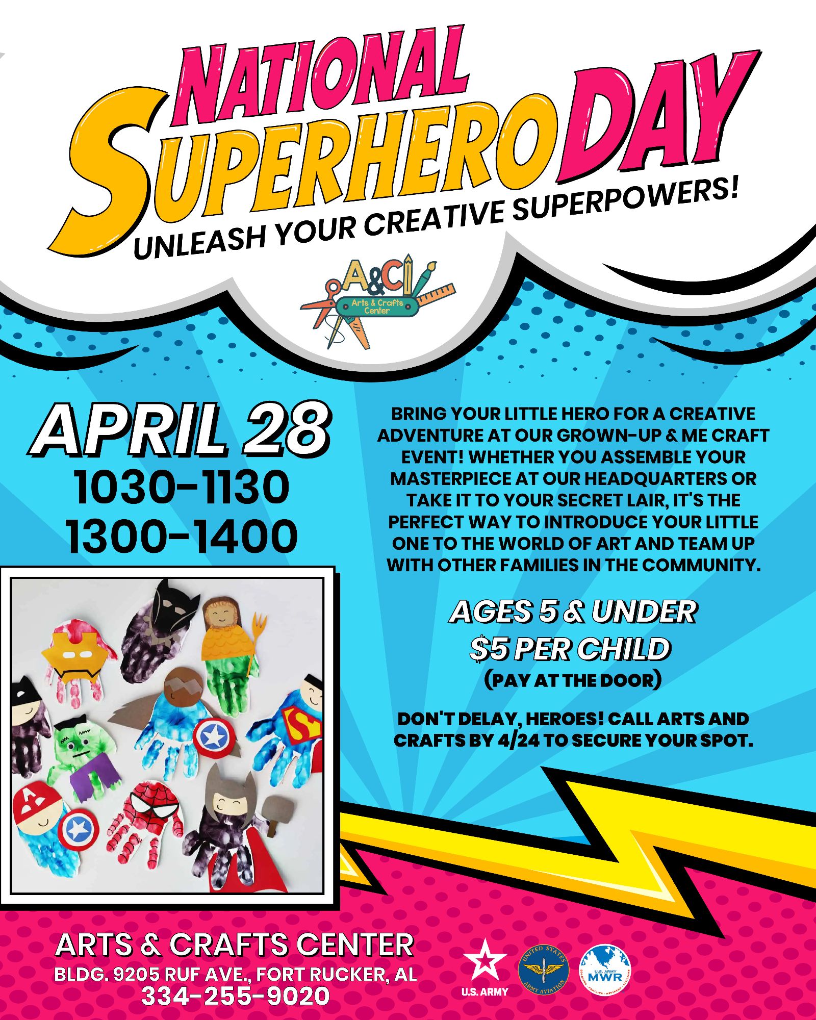 Calling all heroes! Bring your little sidekick to the Arts & Crafts Center for a creative adventure in honor of National Superhero Day. This "Grown-Up & Me" craft event is the perfect way to introduce your little one (ages 5 and under) to the world of art and team up with other families in the community.