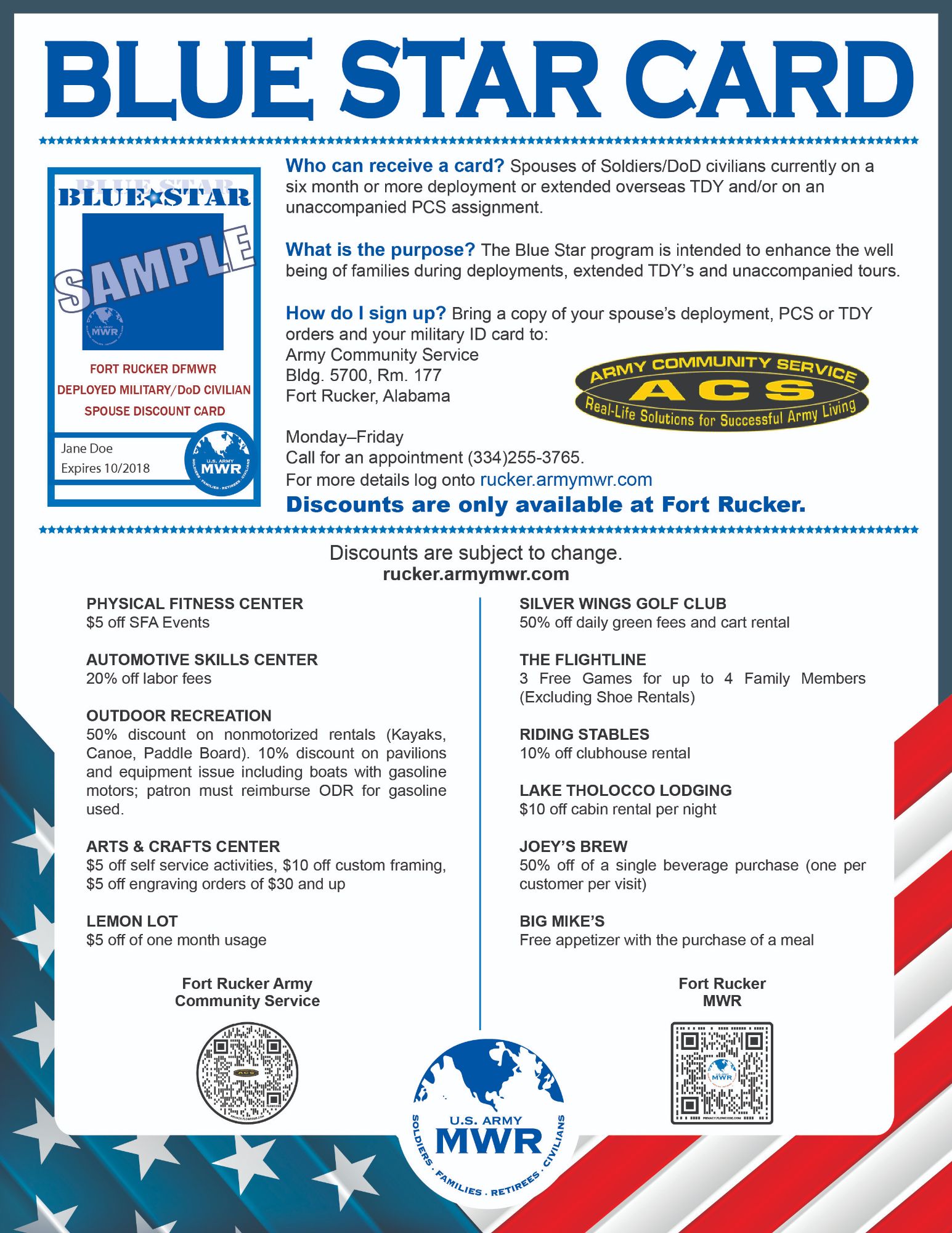 The Directorate of Family and Morale, Welfare and Recreation (DFMWR) Deployed Military/Civilian Spouse or Guardian's Blue Star Card Program is a DFMWR discount and activity card for Spouses or Guardians of children of Soldiers who are deployed or on an unaccompanied tour of duty. Spouses of Soldiers who are deployed qualify for the Blue Star Card program.