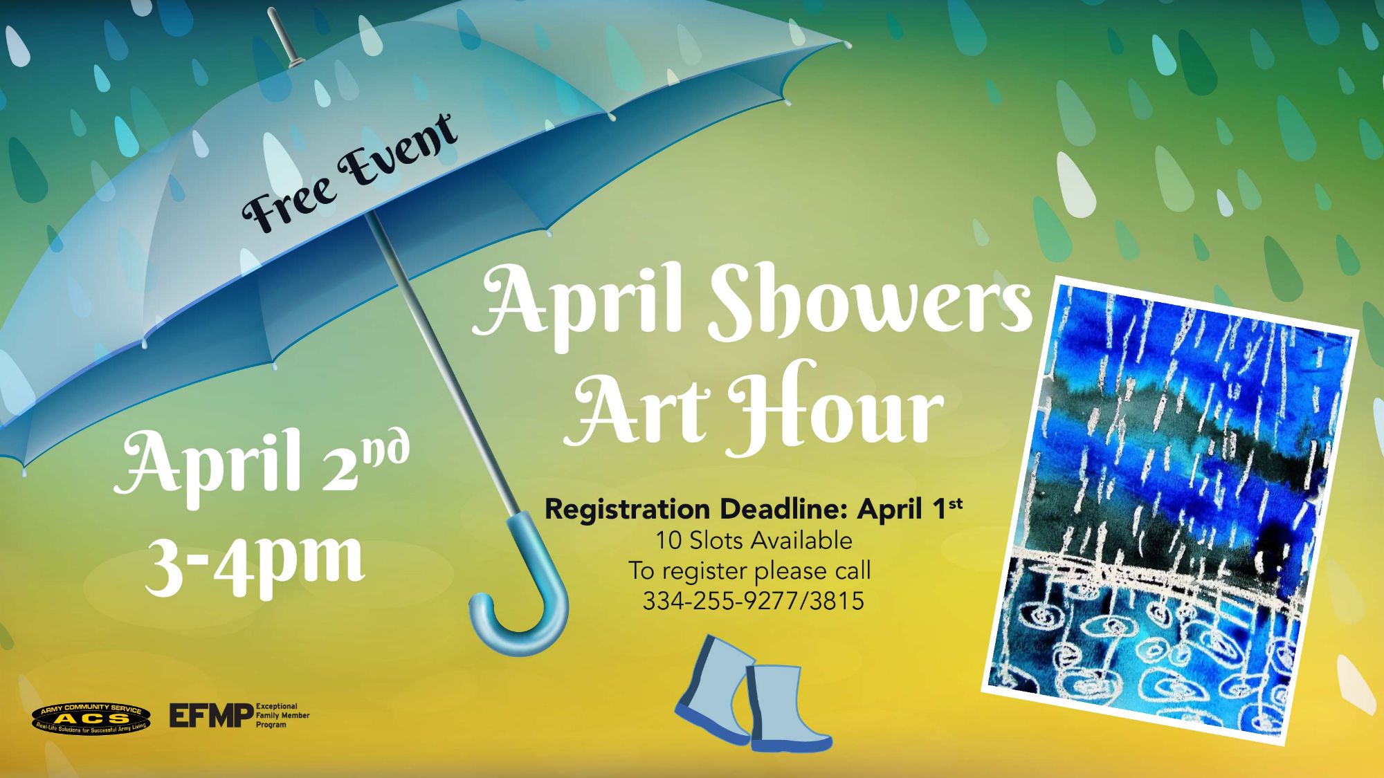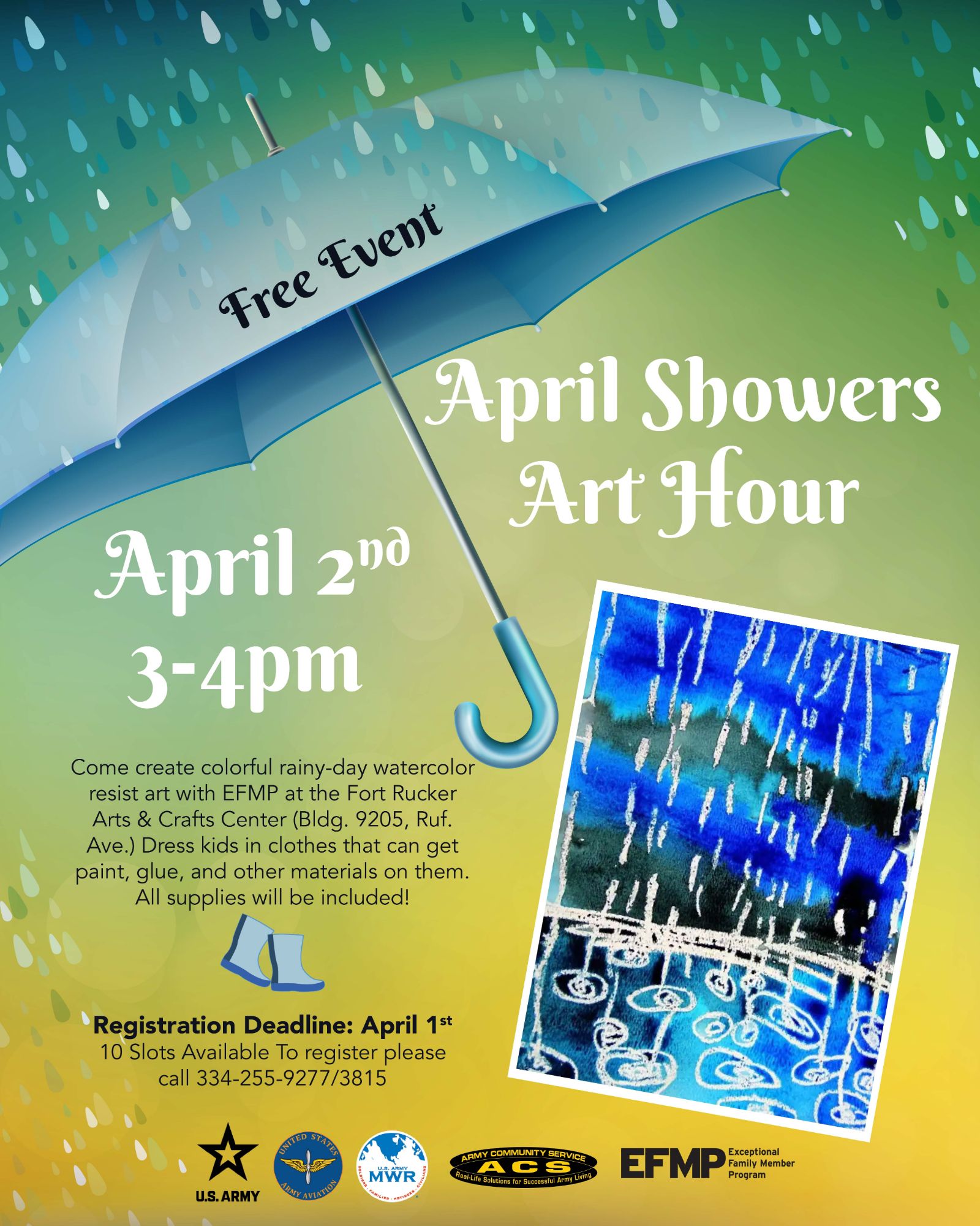 Let your child's creativity shine, even on a rainy day! The Exceptional Family Member Program (EFMP) invites you to a special, FREE "April Showers Art Hour" at the Fort Rucker Arts & Crafts Center.