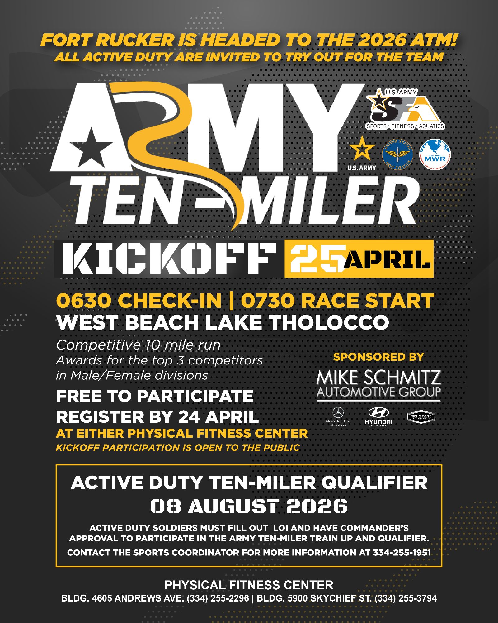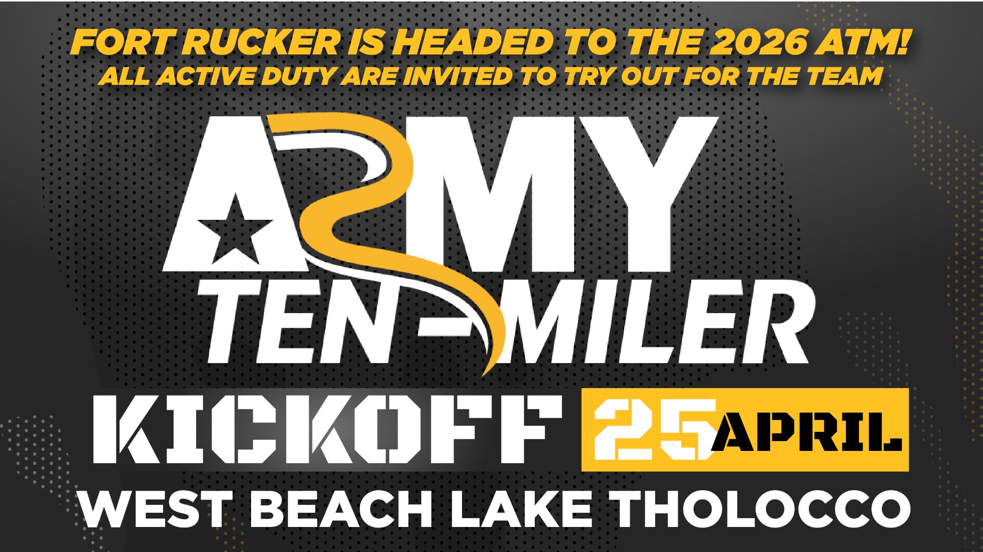 Fort Rucker is heading to the 2026 Army Ten-Miler (ATM), and we're looking for our fastest runners! We are hosting two key events: a Kickoff race open to the entire community and an official Qualifier for Active Duty Soldiers who want to earn a spot on the Fort Rucker team.