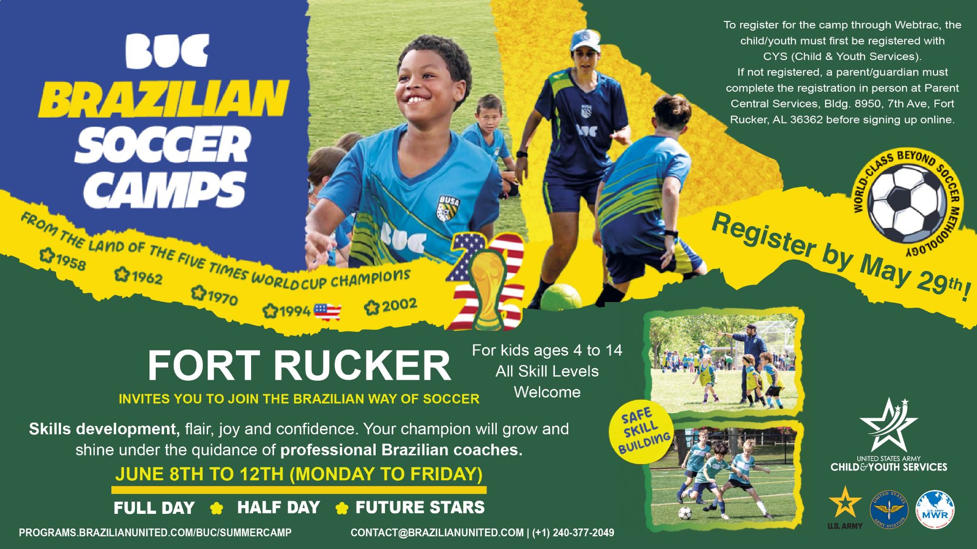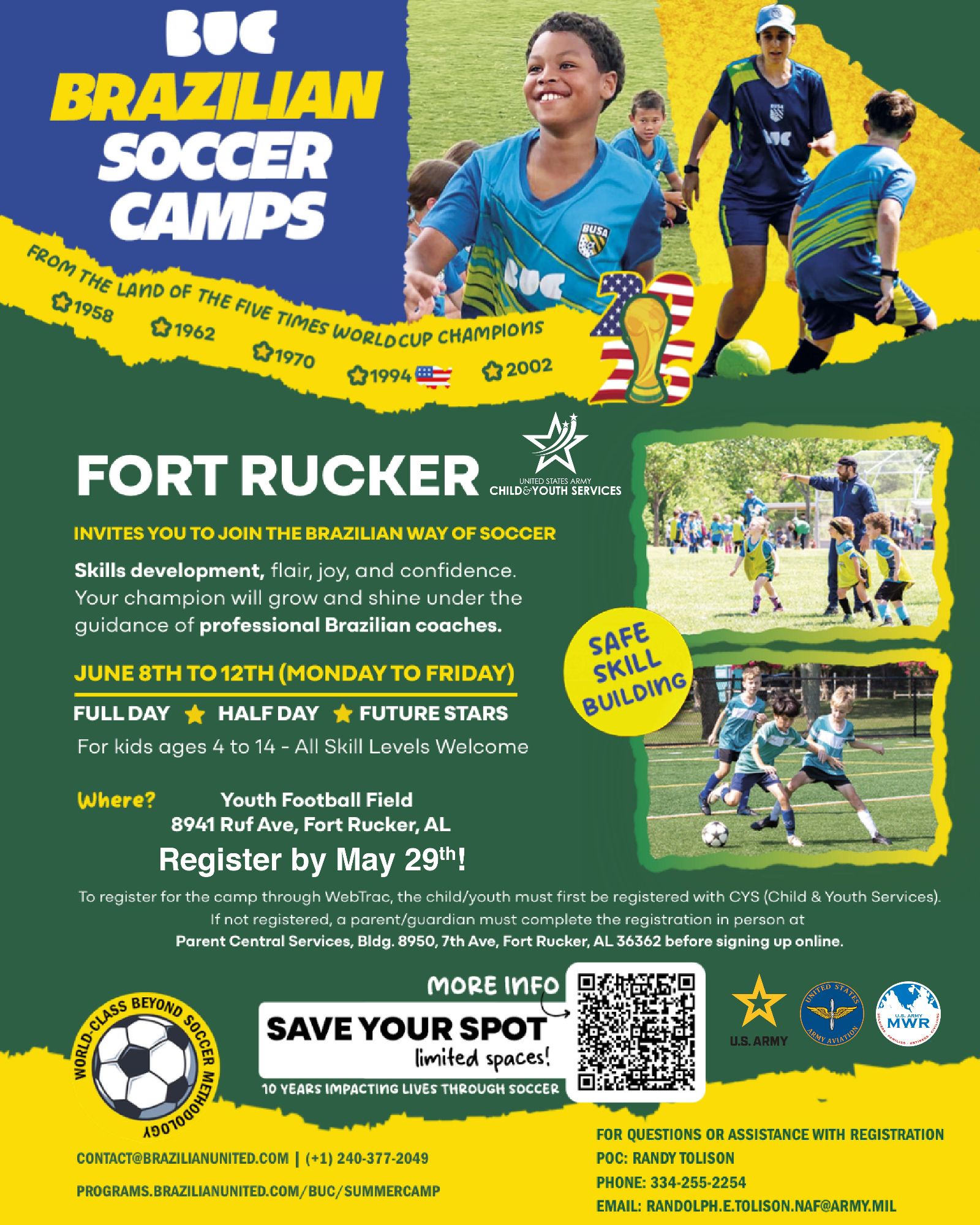 This summer, give your child the opportunity to grow and shine under the guidance of professional Brazilian coaches! Fort Rucker Child & Youth Services (CYS) is excited to host the BUC Brazilian Soccer Camp, a world-class program designed to develop skills, flair, joy, and confidence on the field.
