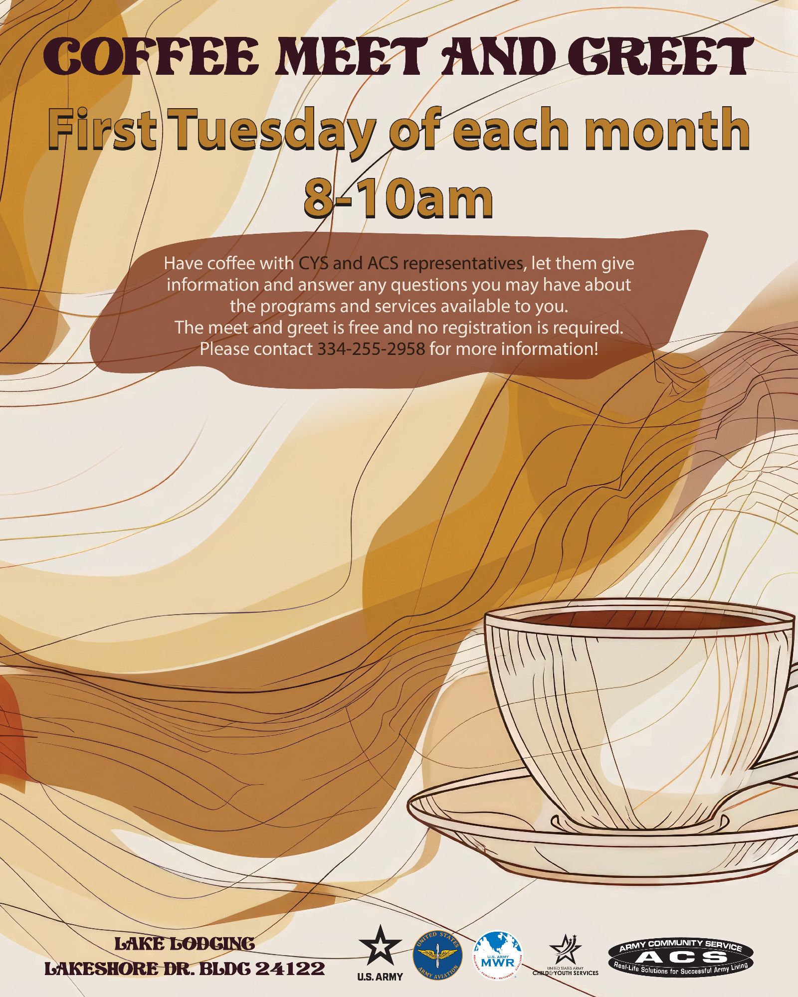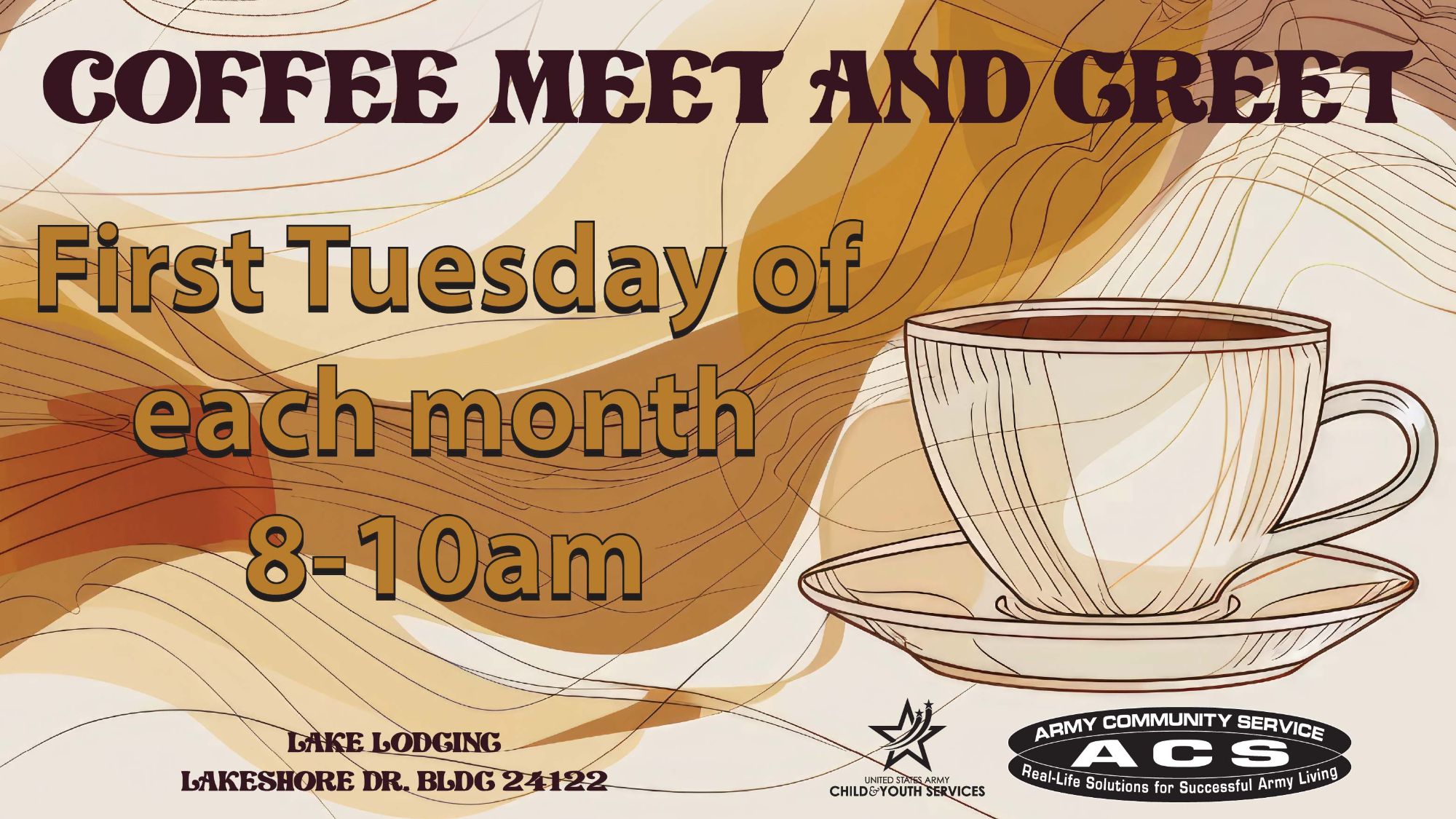 Have questions about the programs and services available to you and your family? Come have a cup of coffee with us! The Coffee Meet and Greet is a wonderful opportunity to connect with representatives from Child & Youth Services (CYS) and Army Community Service (ACS) in a relaxed, informal setting.