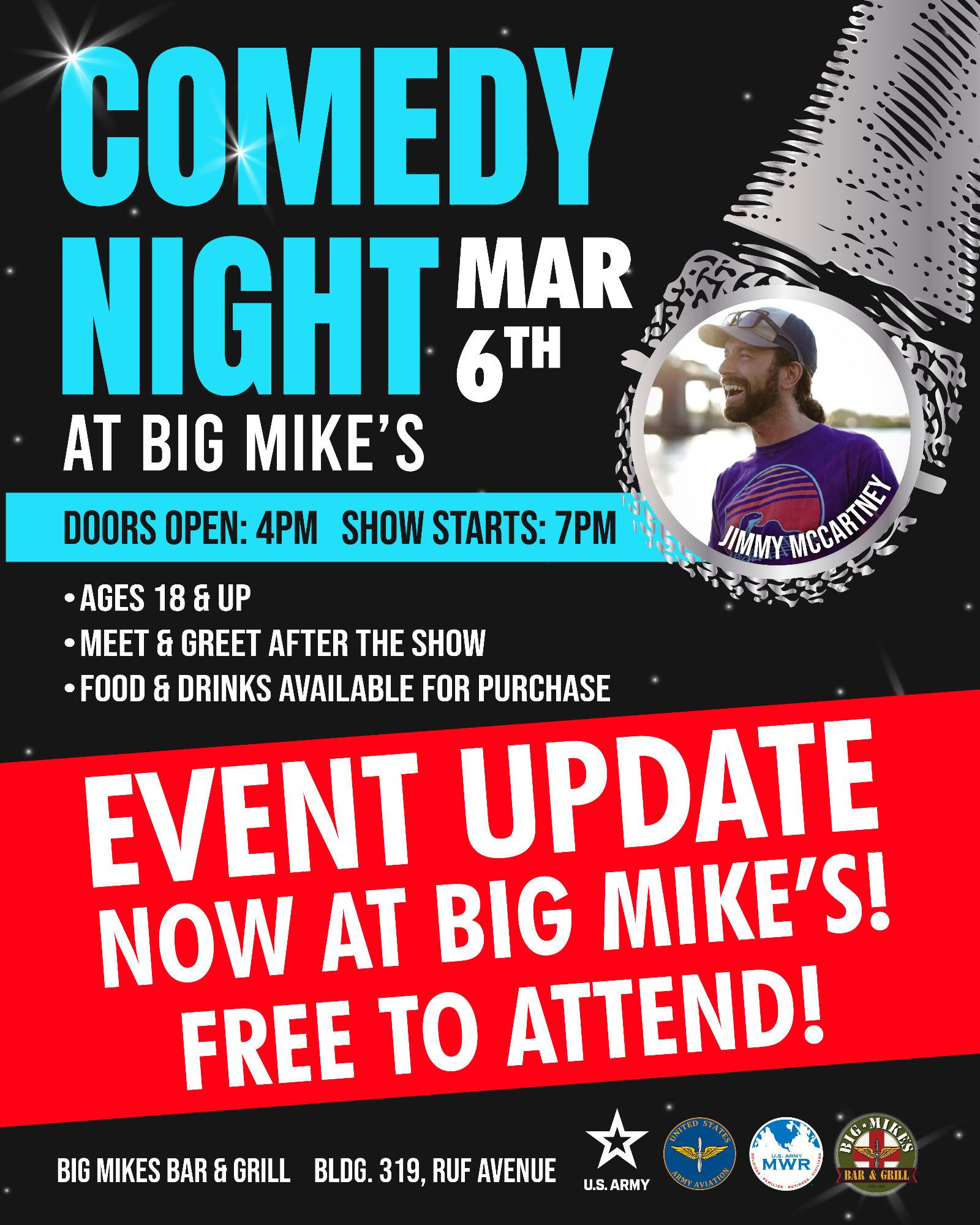 Join us for an unforgettable evening of humor and entertainment at Comedy Night at Big Mike's, featuring the hilarious Jimmy McCartney! Mark your calendars for March 6th for a show that is sure to leave you in stitches.