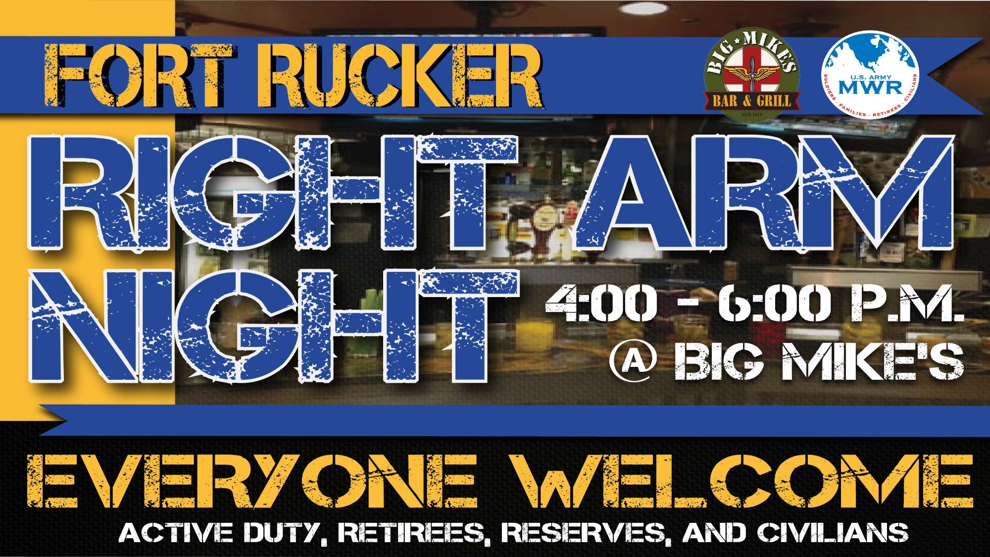 Fort Rucker Right Arm Night is an old Army tradition, promoting a night of camaraderie and esprit de corps as Leaders come together and treat their right arm, (the ones helping them get through daily missions). Our 2026 Sponsor, First Command will have a table set up with information and swag to pass out. This monthly social event is the perfect opportunity for leaders to recognize and connect with their teams in a relaxed and friendly atmosphere.