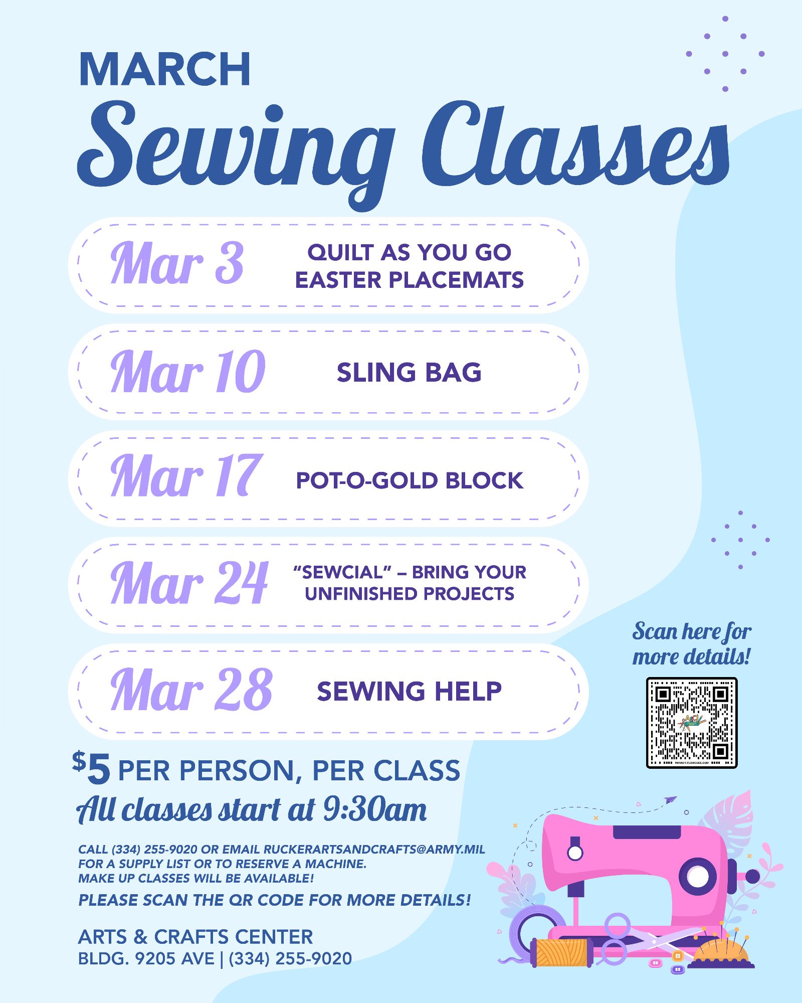 Whether you want to learn a new skill, tackle a fun project, or just need some help finishing something you've already started, the Arts & Crafts Center has a sewing class for you this March! Join our friendly and creative community for a series of fun, project-based classes.