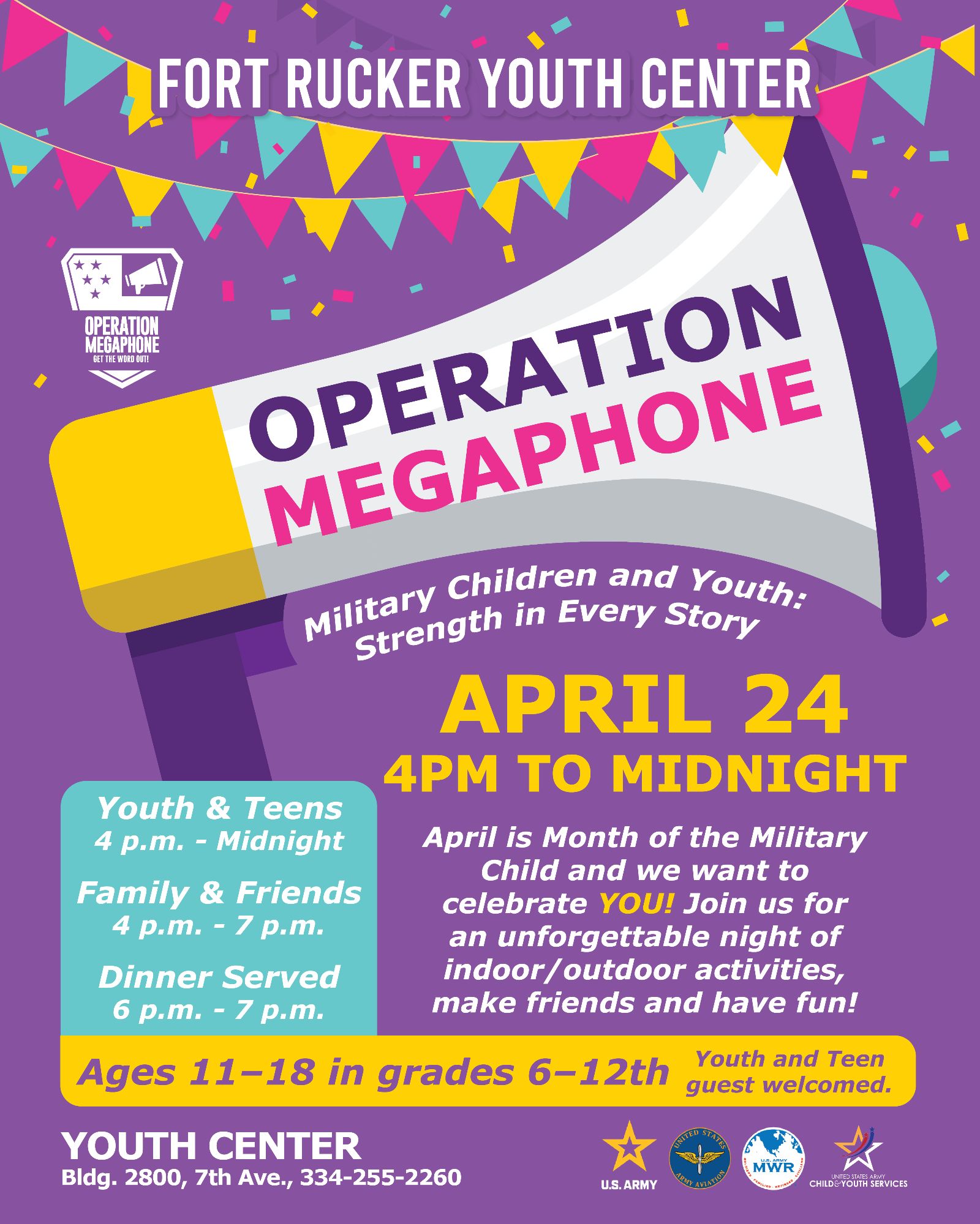 The Fort Rucker Youth Center is celebrating our amazing military kids and teens! In honor of the Month of the Military Child, we're hosting Operation Megaphone, an unforgettable night of fun, friends, and activities. This year's theme is "Military Children and Youth: Strength in Every Story," and we want to celebrate YOU!