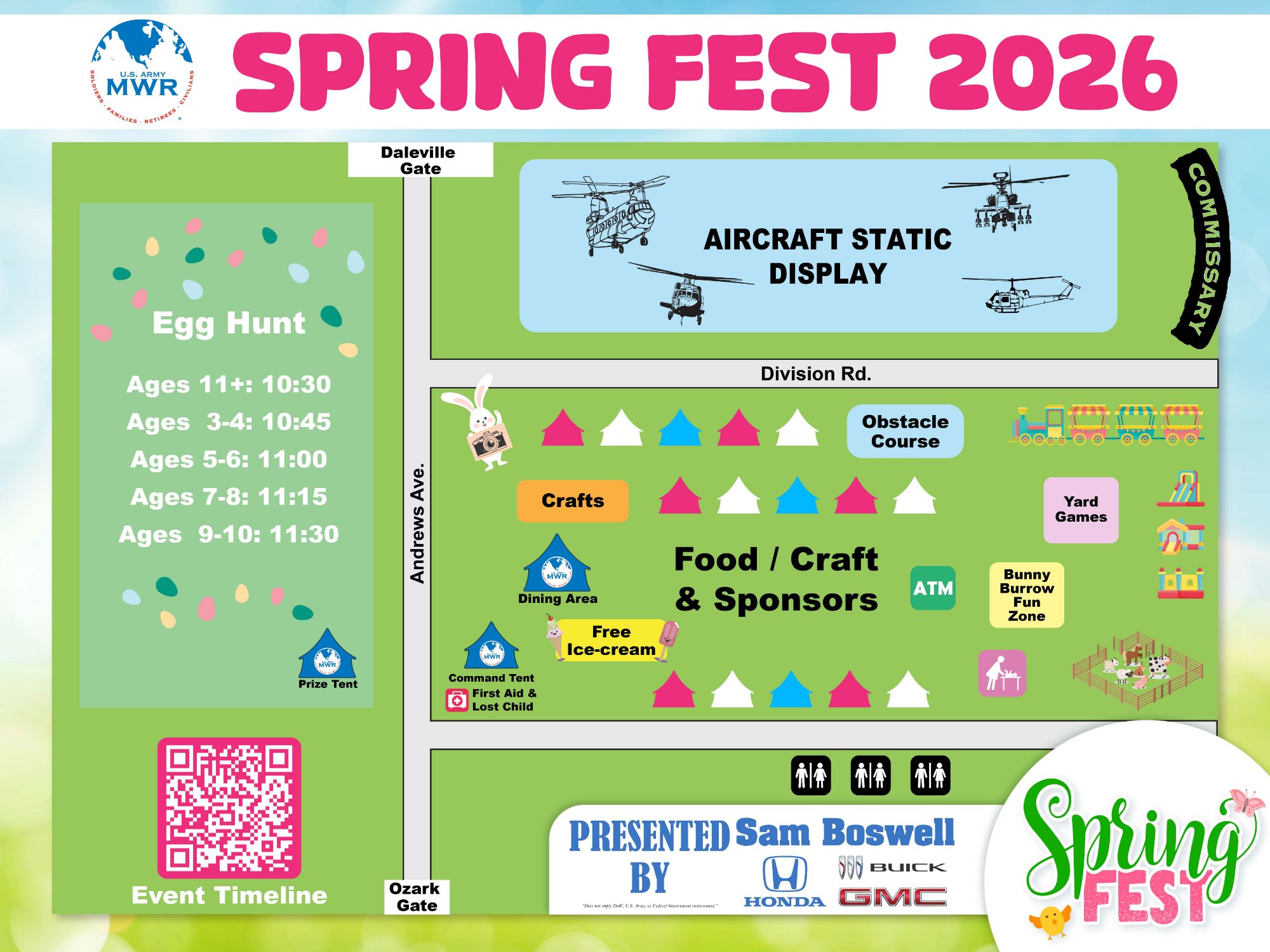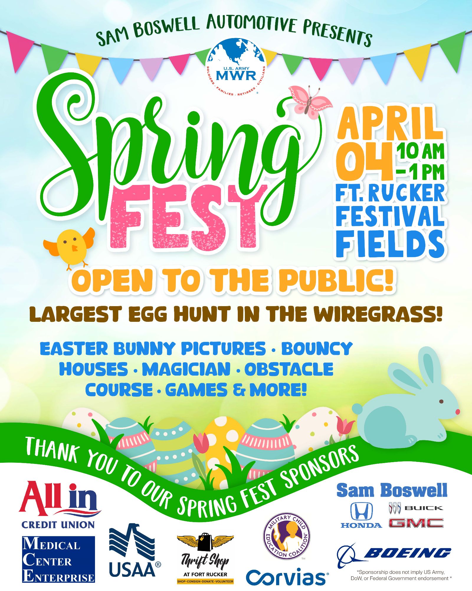 Get ready for the largest egg hunt in the Wiregrass! Sam Boswell Automotive and U.S. Army MWR are proud to present Spring Fest, a fun-filled event for the entire community.