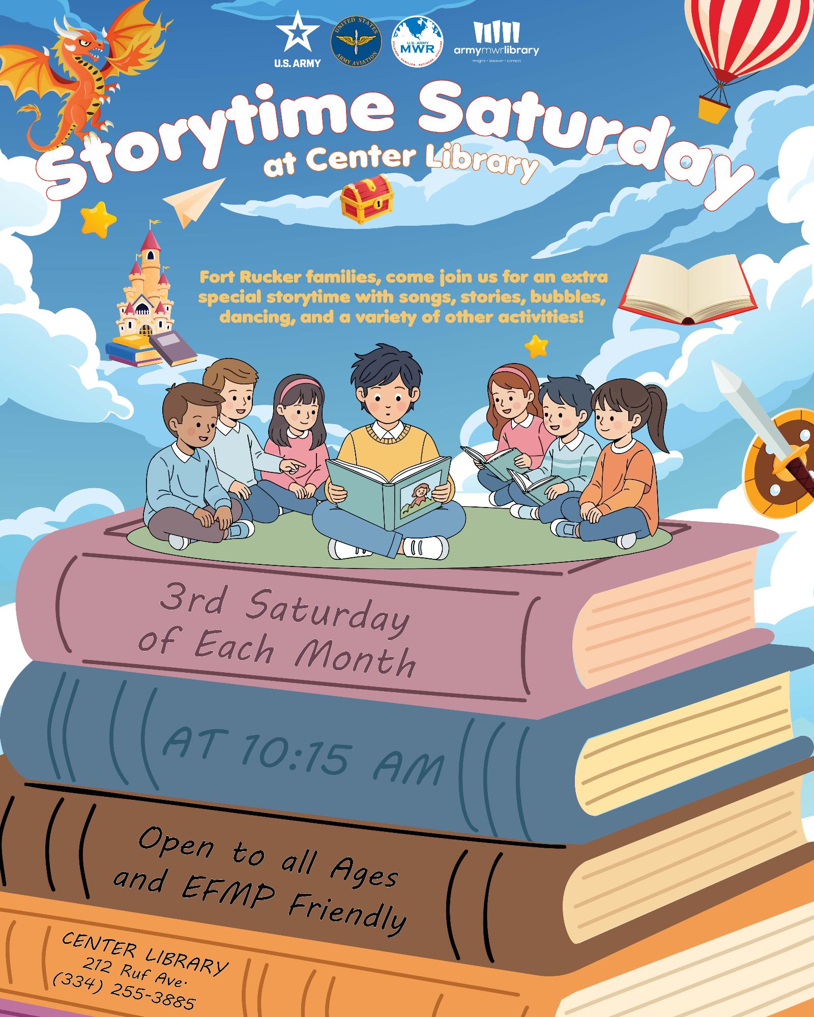 Fort Rucker families, get ready for a morning of wonder and imagination! The Center Library invites you to our extra special Storytime Saturday, a monthly event designed to bring stories to life for children of all ages.