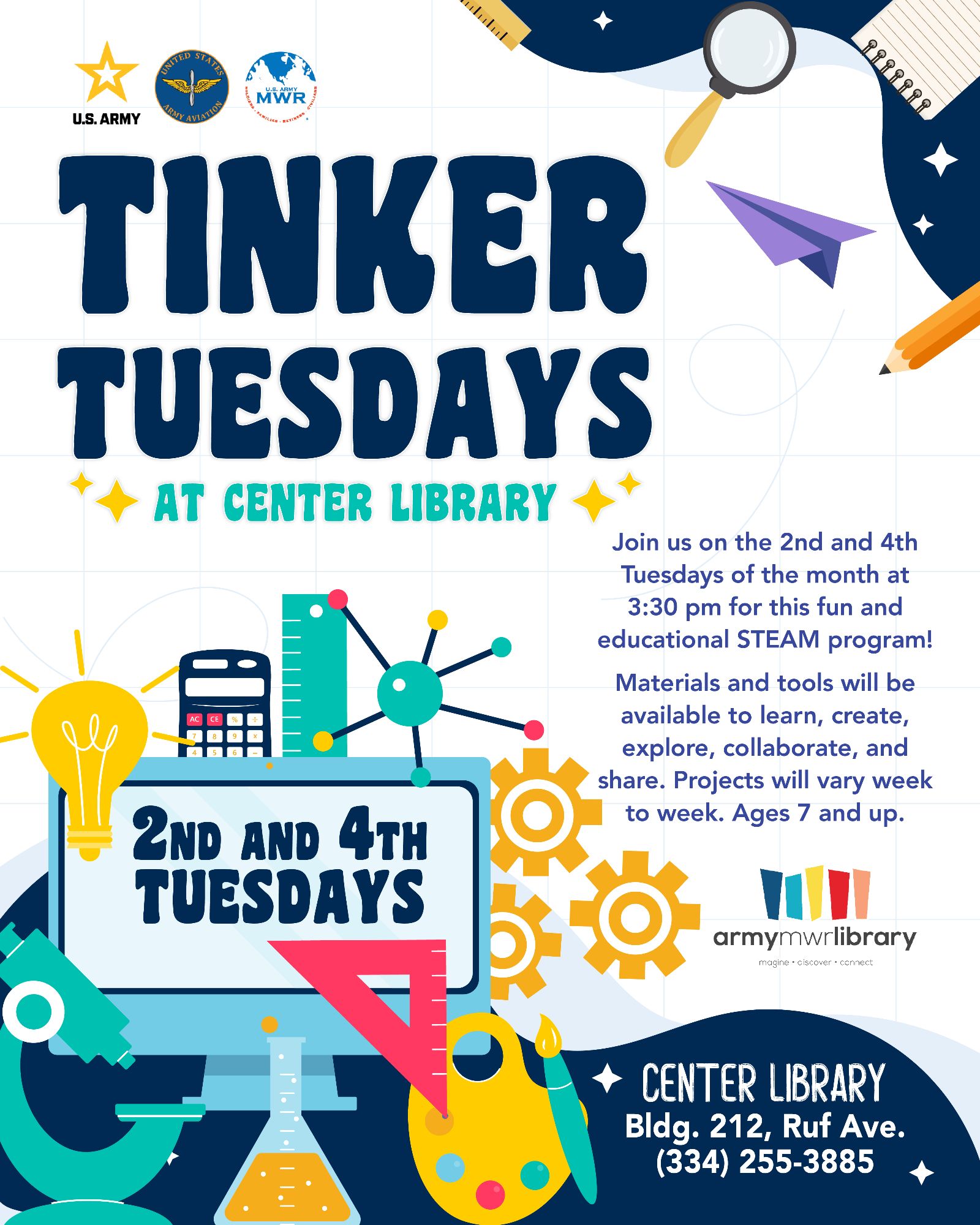 Spark your child's imagination and curiosity with Tinker Tuesdays, our fun and educational STEAM program! Hosted by the armymwrlibrary, this is the perfect opportunity for young creators to dive into the world of Science, Technology, Engineering, Arts, and Math.