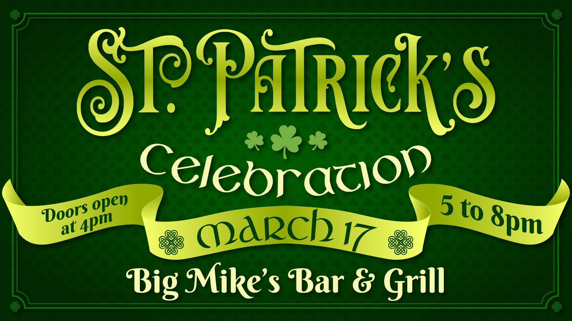 Get ready for a sham-rockin' good time! VRAI Simulation presents a St. Patrick's Day Celebration at Big Mike's Bar & Grill on March 17th from 5 pm to 8 pm. Doors open at 4 pm, so come early and grab a good spot!