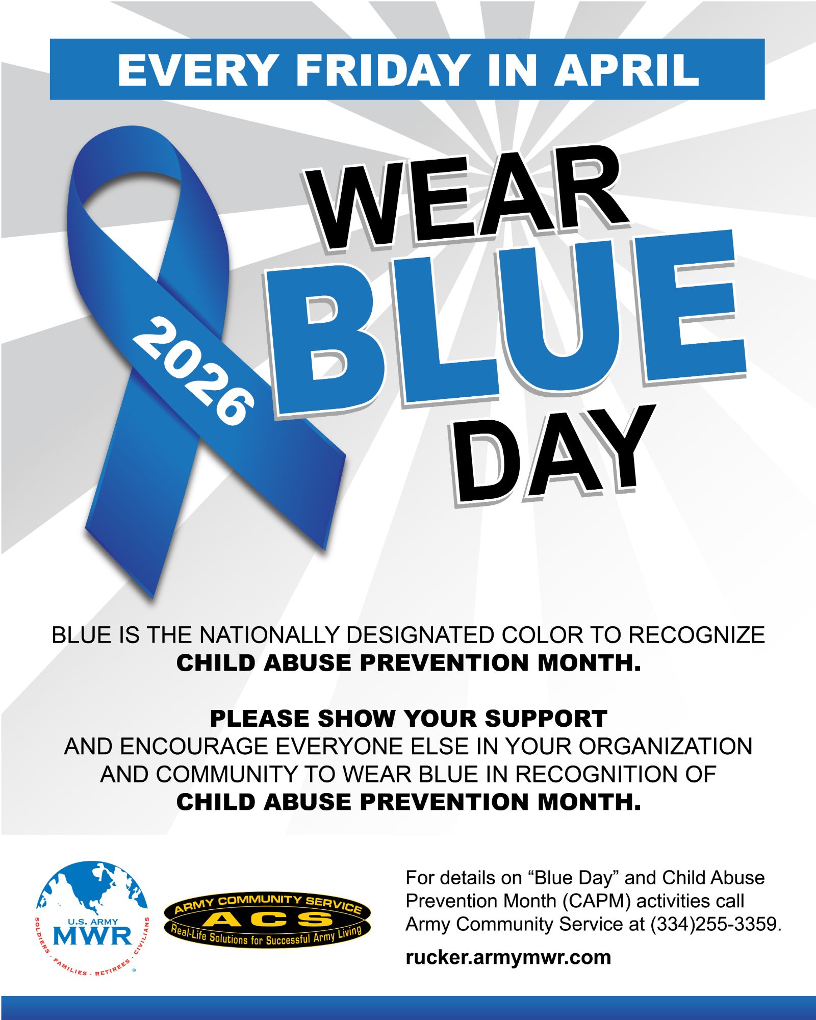 For more information on "Wear Blue Day" and other Child Abuse Prevention Month (CAPM) activities, please call Army Community Service at (334) 255-3359 or visit rucker.armymwr.com.