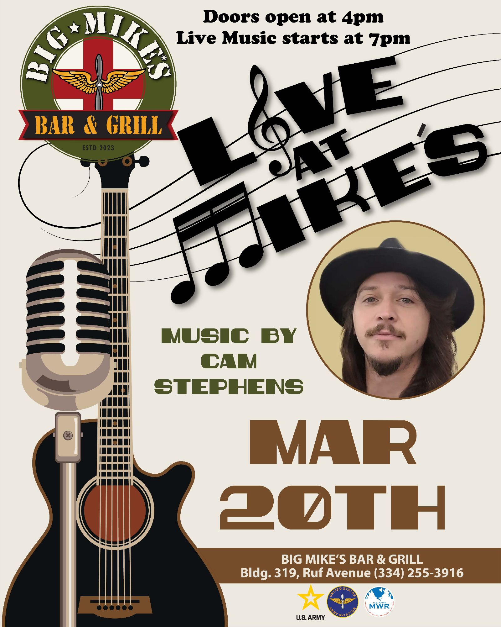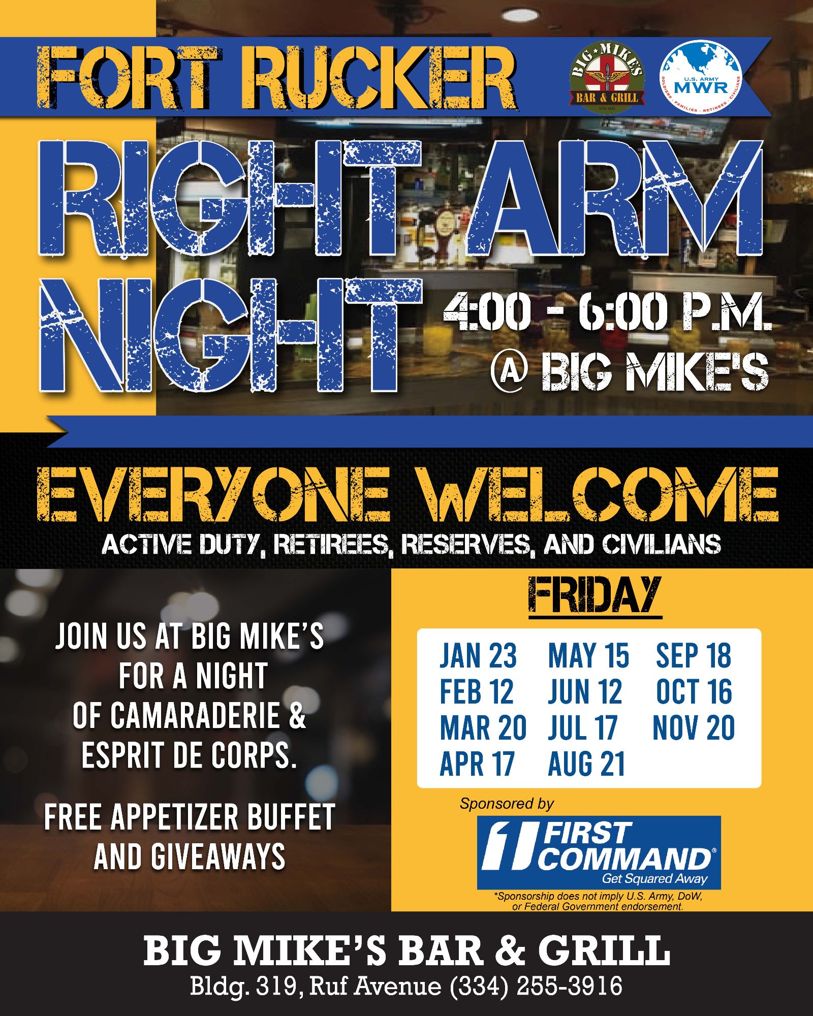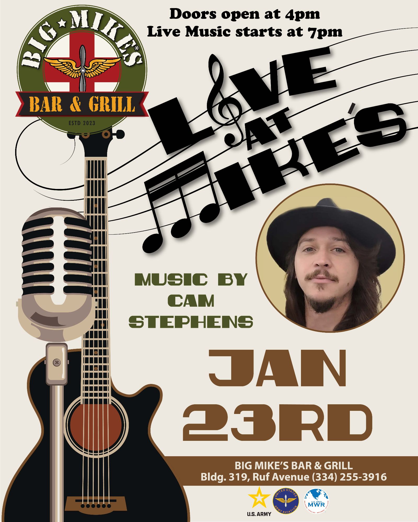 Big Mike's Fort Rucker Bar & Grill is located near the Holiday Inn Express, on Ruf Avenue, and offers a “roadhouse feel” with nods to the history of Army Aviation offering a full-service bar and 16 flat screen TVs. Big Mike's is open to the public, seven days a week.