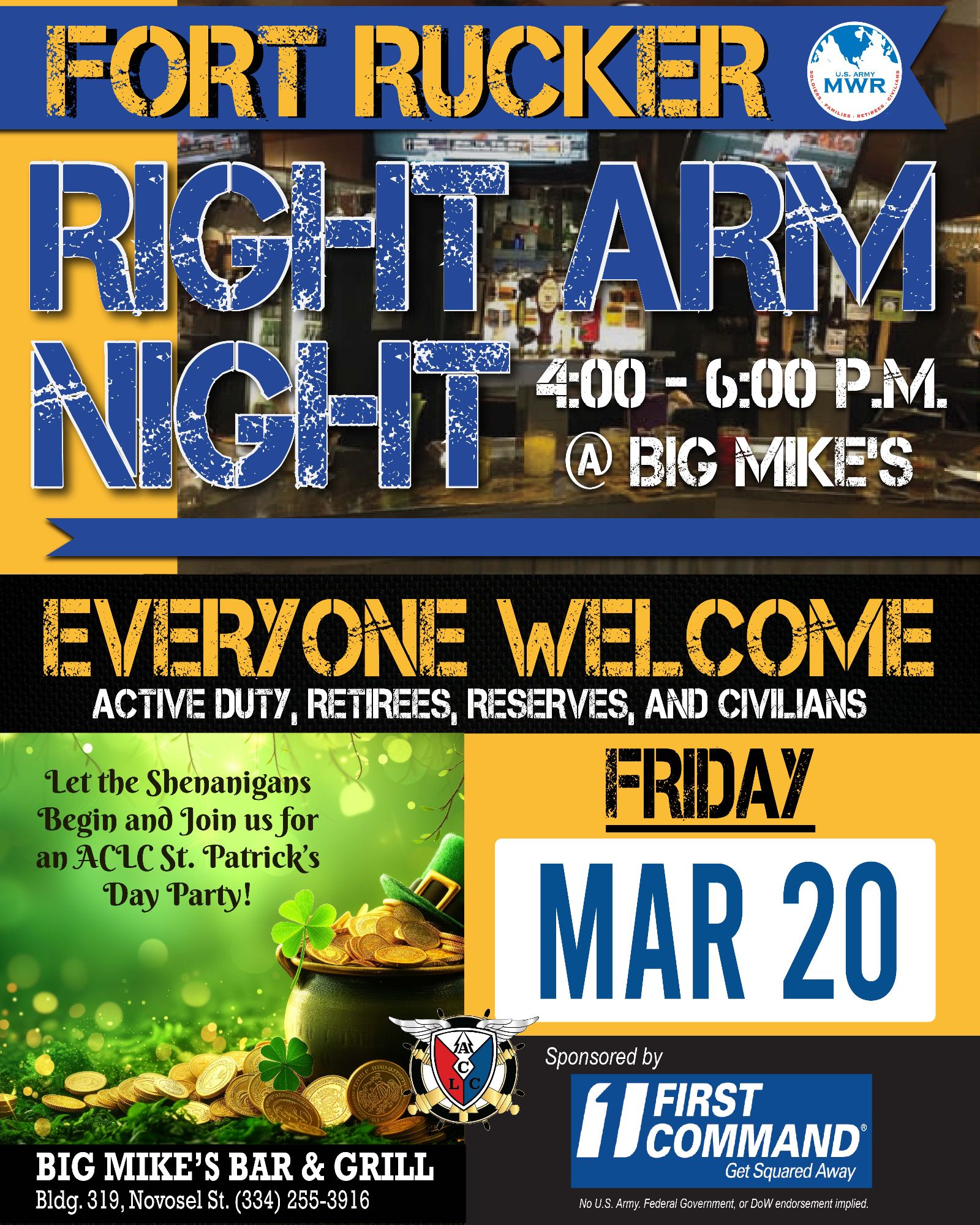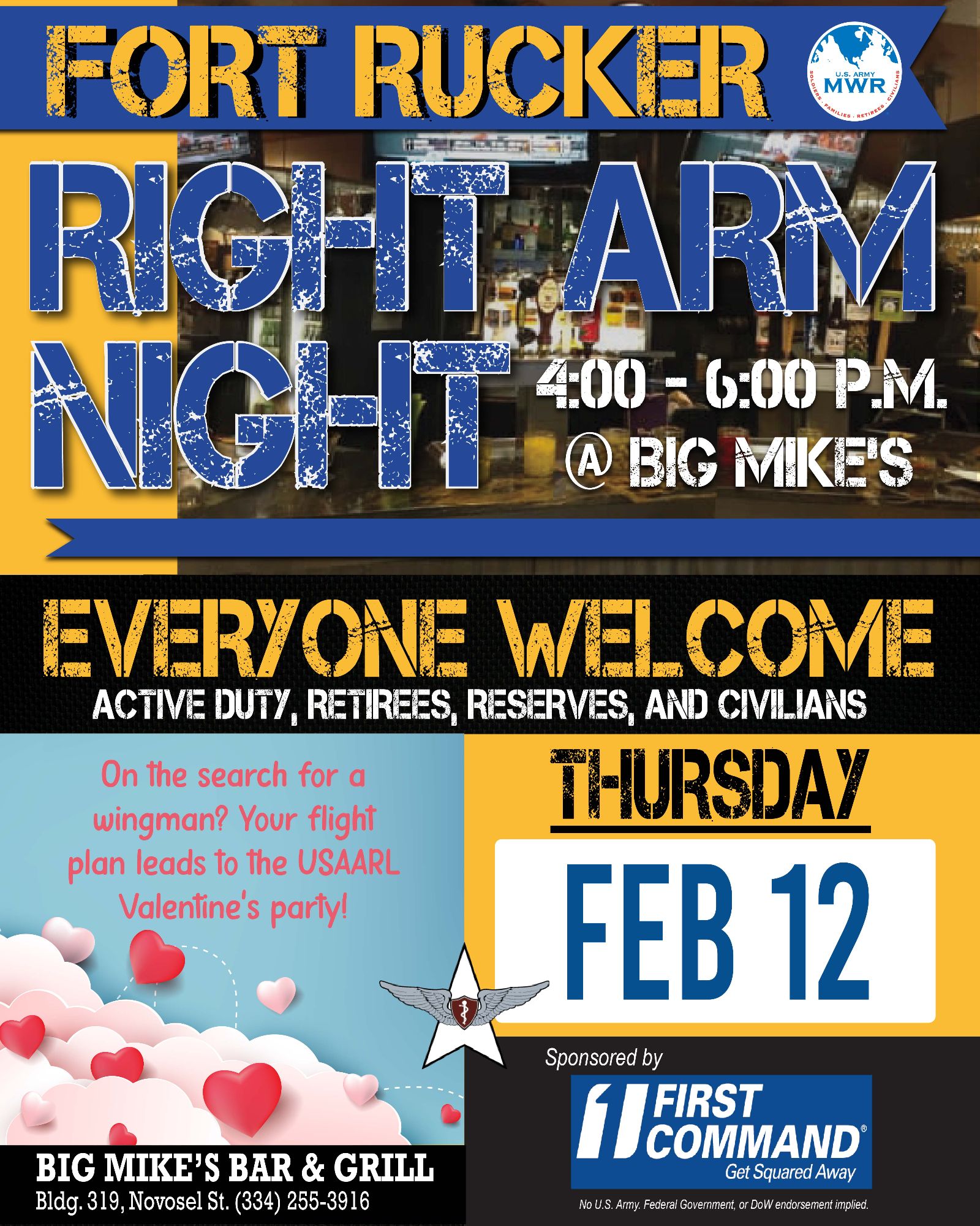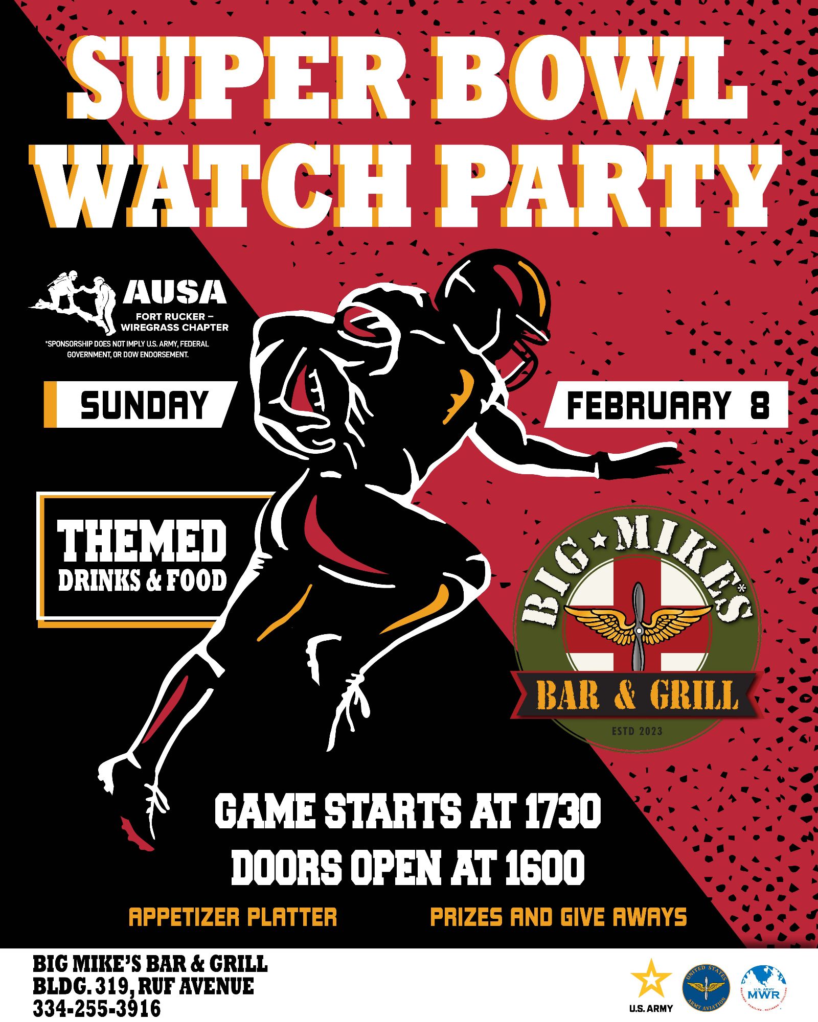 Big Mike's Fort Rucker Bar & Grill is located near the Holiday Inn Express, on Ruf Avenue, and offers a “roadhouse feel” with nods to the history of Army Aviation offering a full-service bar and 16 flat screen TVs. Big Mike's is open to the public, seven days a week.