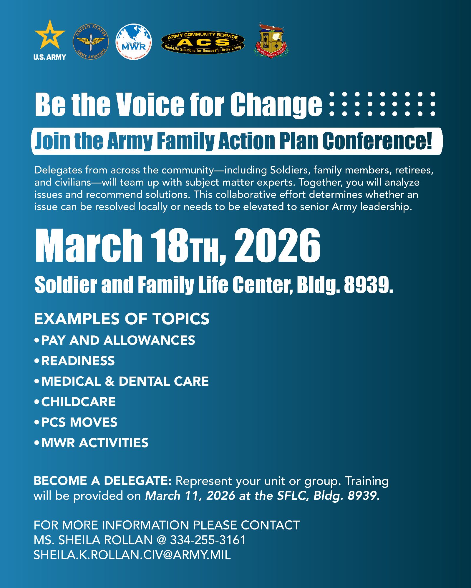 Army Family Action Plan (AFAP) wants you to share your issues! This grass roots community program helps resolve issues that impact Soldiers and their Families, Civilians and Survivors.