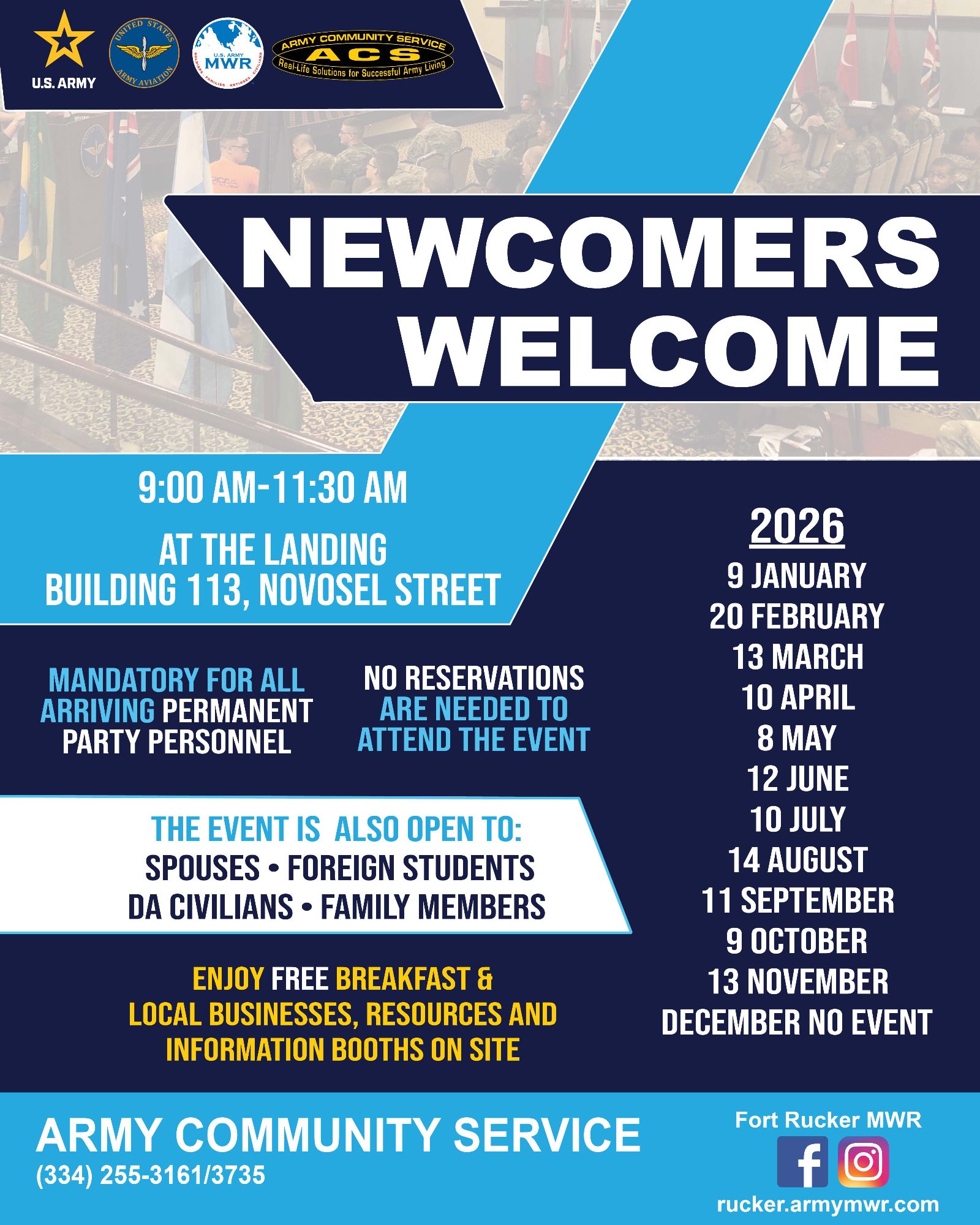 All active duty permanent party personnel newly assigned or attached to units, directorates and activities associated with Fort Rucker will attend Army Community Service’s Newcomers’ Welcome. This welcome is designed to assist military personnel, Family members, and DA civilian by providing information about the Fort Rucker community. Newly arrived Soldiers, DA civilians, and Family members are welcomed by the command group. They receive information from representatives on the installation and the surrounding communities. Newcomers’ Welcome is scheduled for every third Friday of the month at 9:00 a.m. at The Landing. Childcare is provided by the Child Development Center with 24 hours advance reservations. Children must be registered at the Child, Youth and School Services Parent Central Services. Registration is free.
