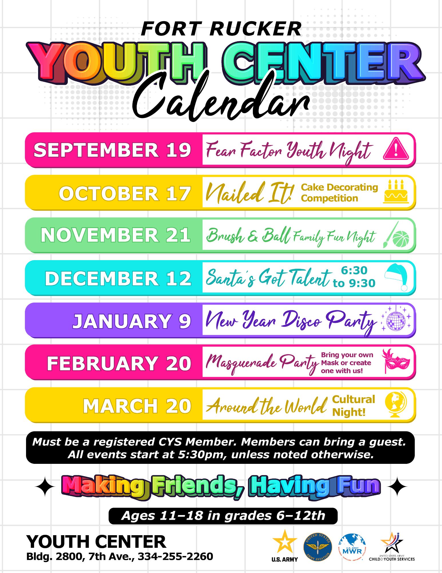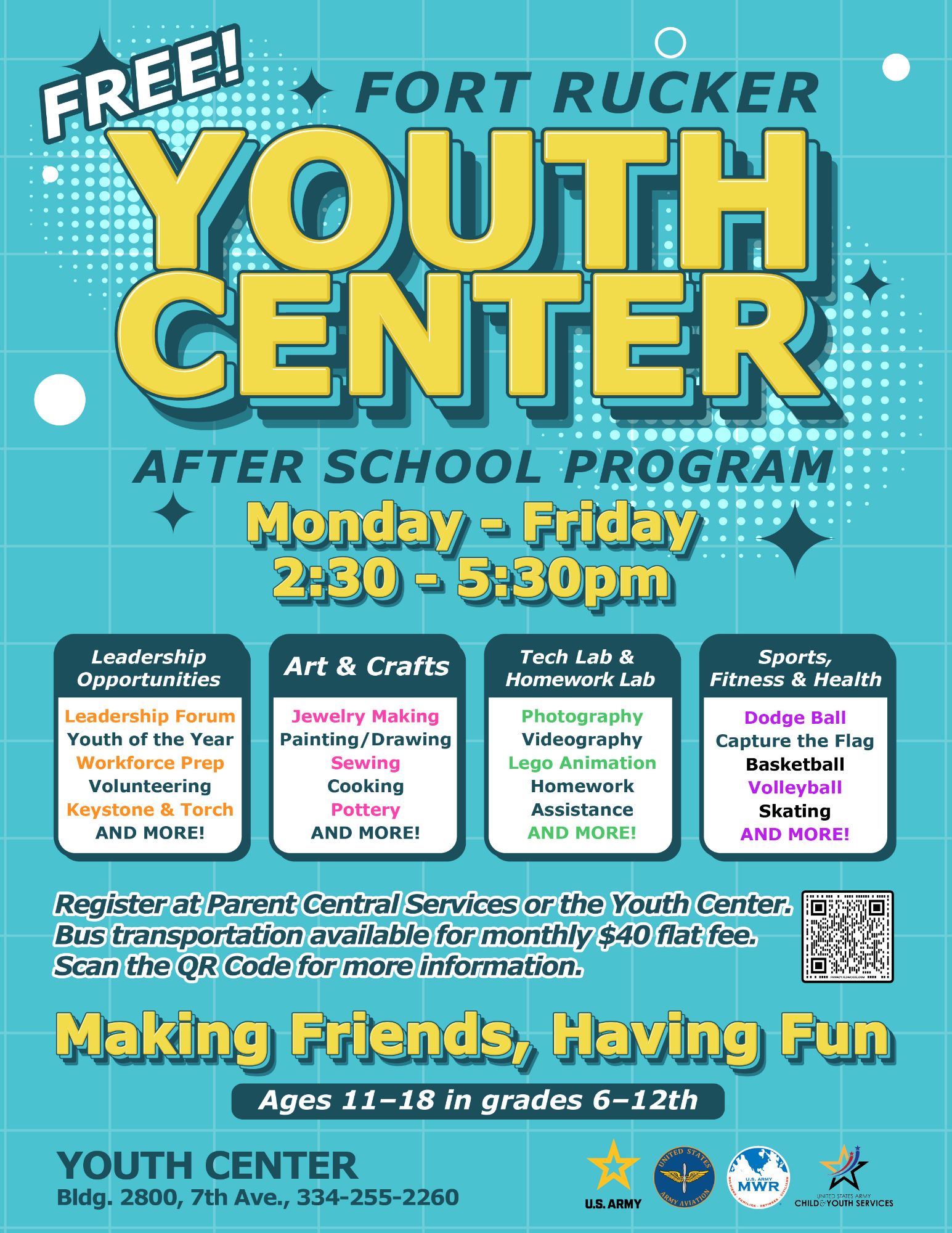 The Youth Center has a wide range of programs, offering fun-filled afternoons and evenings. Free Middle School Teen (MST) programs are offered daily after school and in the afternoons during the summer for youth ages 11–15 and teens ages 16–18. MST morning camps are also offered at a nominal fee during the summer to complement the free afternoon program (minimum of 10 participants required). There are special activities for youth ages 11–18 scheduled on a continual basis, including social activities and field trips. CYS programs utilize partnerships with 4-H Clubs Boys and Girls Clubs of America to bring enhanced curriculum and other opportunities for growth and development to our children and youth. Programs are intended to offer positive alternatives that will minimize “at risk” behavior during parental duty hours.