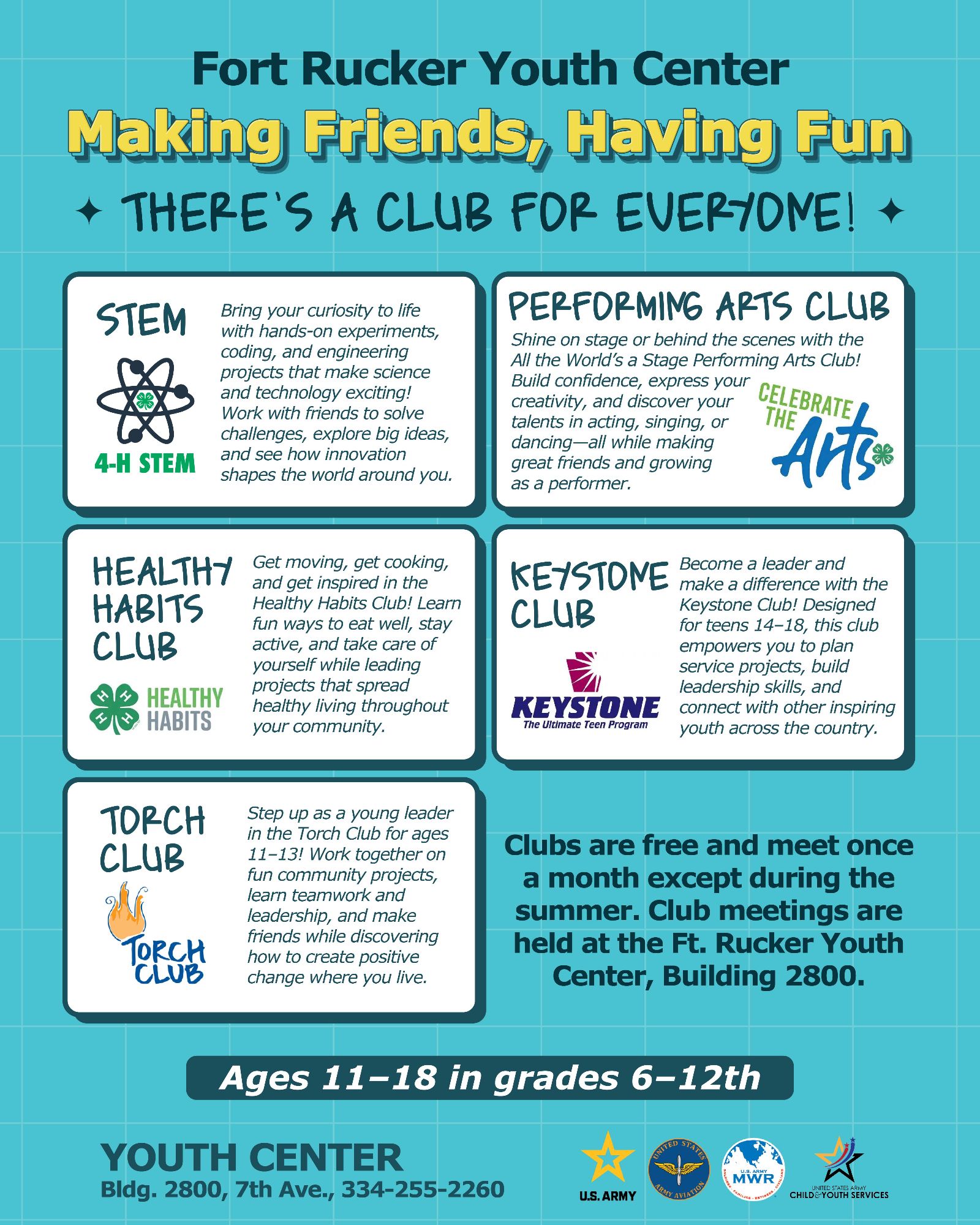 At the Ft. Rucker Youth Center, we believe every young person deserves a safe, positive, and inspiring space to grow, explore, and thrive. Serving middle school and teen youth ages 11–18, our programs are designed to support personal development, build leadership skills, and create meaningful connections — “Making Friends, Having Fun!”